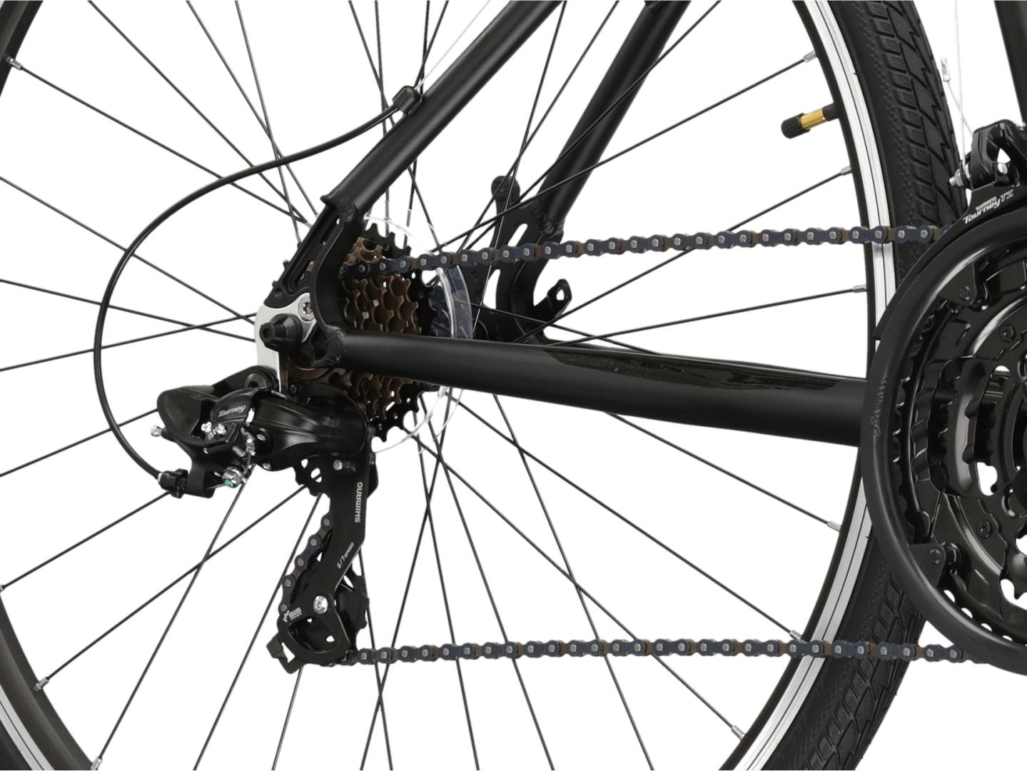 KROSS Evado 1.0 stworzyliśmy z myślą o tym, by sprawiał Ci przyjemność z pokonywania każdego kilometra trasy. Sprawdzony napęd z 21 przełożeniami zapewnia komfortową jazdę w każdym terenie. Tylna przerzutka z grupy Tourney to trwała i sprawdzona konstrukcja, która zapewnia płynną i responsywną zmianę przełożeń niezależnie od warunków na trasie.