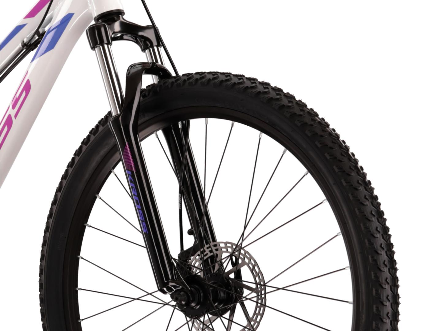 Amortyzowany widelec ze skokiem 80 mm zapewnia wysoką kulturę pracy oraz doskonałe tłumienie wibracji powstających podczas jazdy po nierównej i wyboistej nawierzchni.