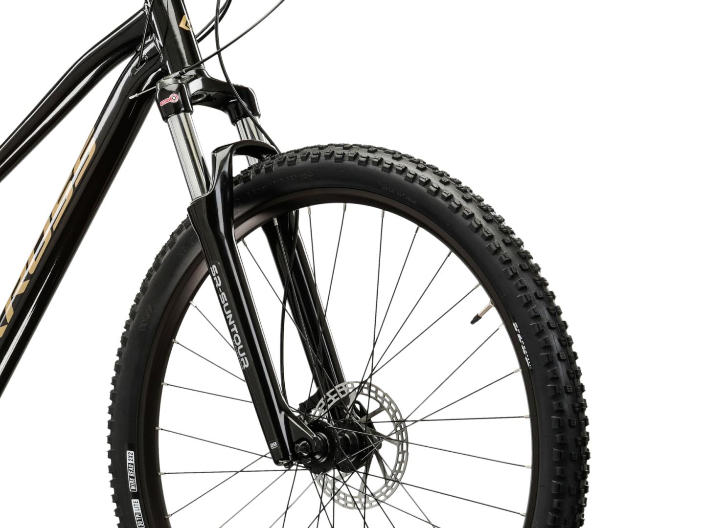 Amortyzowany widelec SR Suntour ze skokiem 100 mm zapewnia wysoką kulturę pracy oraz doskonałe tłumienie wibracji powstających podczas jazdy po nierównej i wyboistej nawierzchni. Dodatkowo, na kierownicy znajduje się manetka blokady amortyzatora, która umożliwia zwiększenie efektywności pedałowania na płaskich odcinkach drogi.