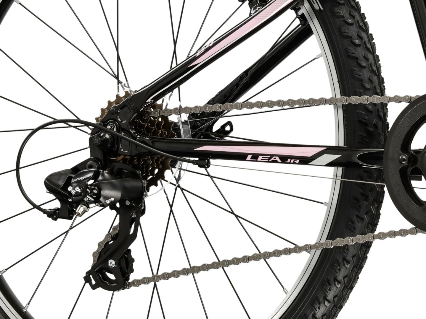 Rower KROSS Lea JR 24 został wyposażony w napęd w systemie 1x8. Umożliwi to sprawne pokonywanie podjazdów oraz szybką jazdę po płaskich odcinkach. Tylna przerzutka od Shimano to trwała i sprawdzona konstrukcja, która zapewnia płynną zmianę przełożeń.