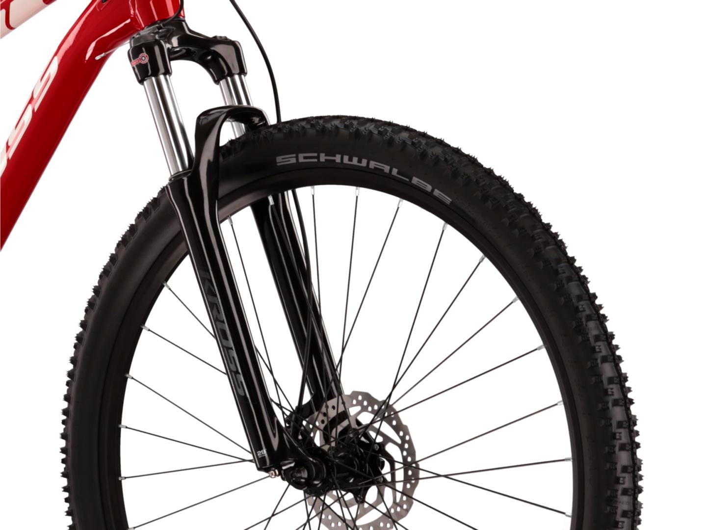 Amortyzowany widelec SR Suntour ze skokiem 100 mm zapewnia wysoką kulturę pracy oraz doskonałe tłumienie wibracji powstających podczas jazdy po nierównej i wyboistej nawierzchni. Dodatkowo, na kierownicy znajduje się manetka blokady amortyzatora, która umożliwia zwiększenie efektywności pedałowania na płaskich odcinkach drogi.