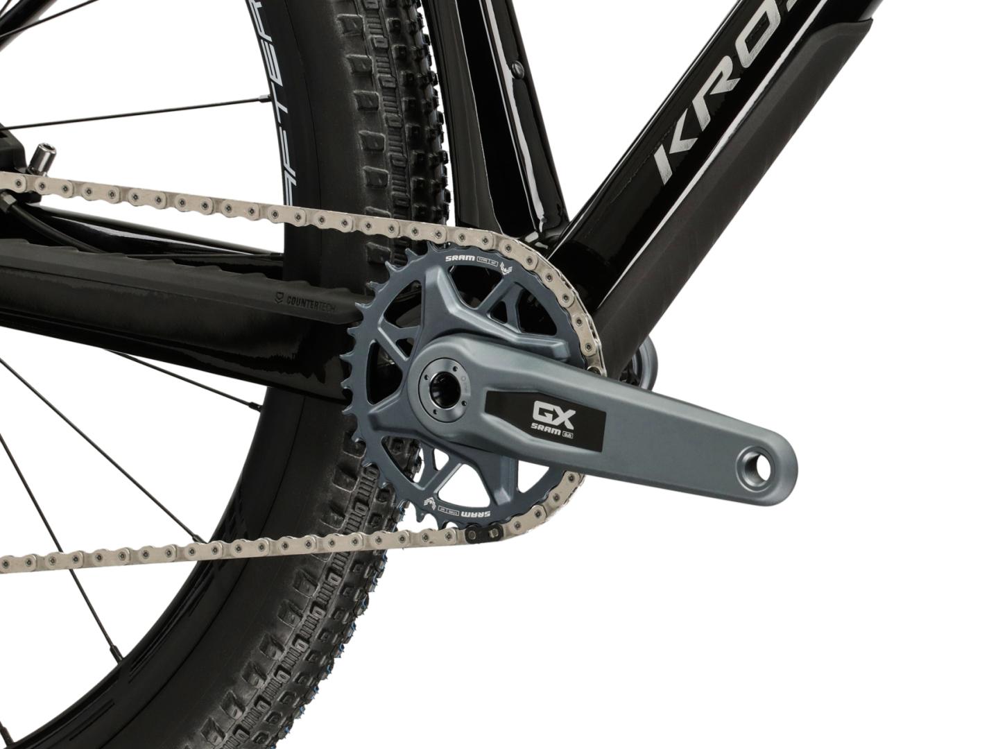 Rower górski KROSS Level RS 4.0 został wyposażony w sprawdzone komponenty, które mają za zadanie bezpiecznie przeprowadzić cię przez najtrudniejsze trasy. Posiada on napęd SRAM działający w systemie 1x12. Tylna przerzutka z grupy Eagle doskonale sprawdza się w trudnym technicznie terenie gwarantując sprawną i dokładną zmianę przełożeń oraz zapobiega uderzaniu łańcucha o ramę oraz jego spadaniu.