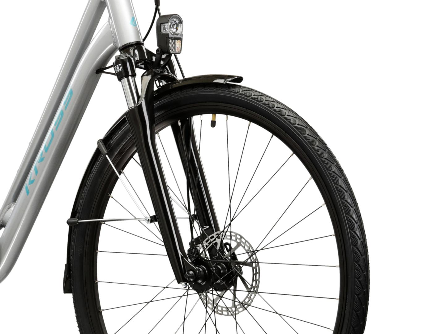 Zintegrowane z rowerem oświetlenie ułatwi jazdę po zmroku, a wysokiej jakości siodełko zachwyci Cię komfortem, jaki zaoferuje Ci podczas pokonywania długich tras. Dodatkowo, siodło zostało osadzone na amortyzowanej sztycy, co niweluje drgania powstające podczas jazdy po nierównościach.
