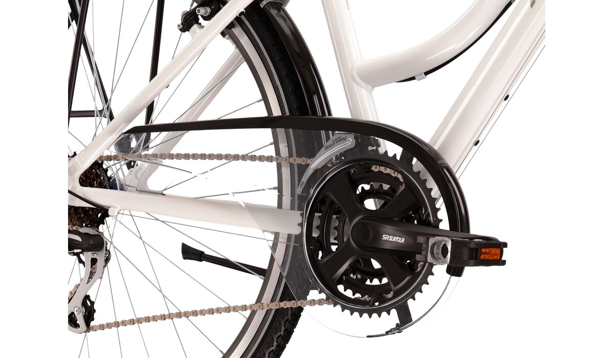Amortyzowany widelec SR Suntour ze skokiem 50 mm sprawi, że bez problemu dojedziesz do miejsca docelowego bez martwienia się o krawężniki czy kostkę brukową. W lesie natomiast możliwa będzie jazda bez obaw o kamienie czy korzenie.