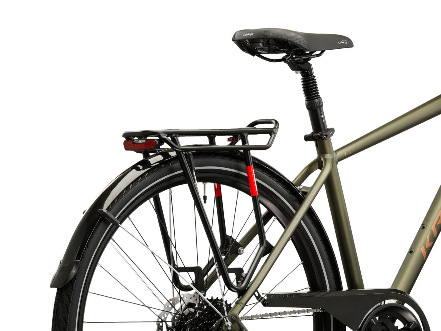 W rowerze trekkingowym nie mogło zabraknąć solidnego i stabilnego bagażnika. Umożliwia on przewożenie niezbędnego ekwipunku, a także nie będzie problemem montaż na nim dodatkowych sakw. Do kompletu trafił również system pełnych błotników, który zapewnia doskonałą ochronę przed błotem.