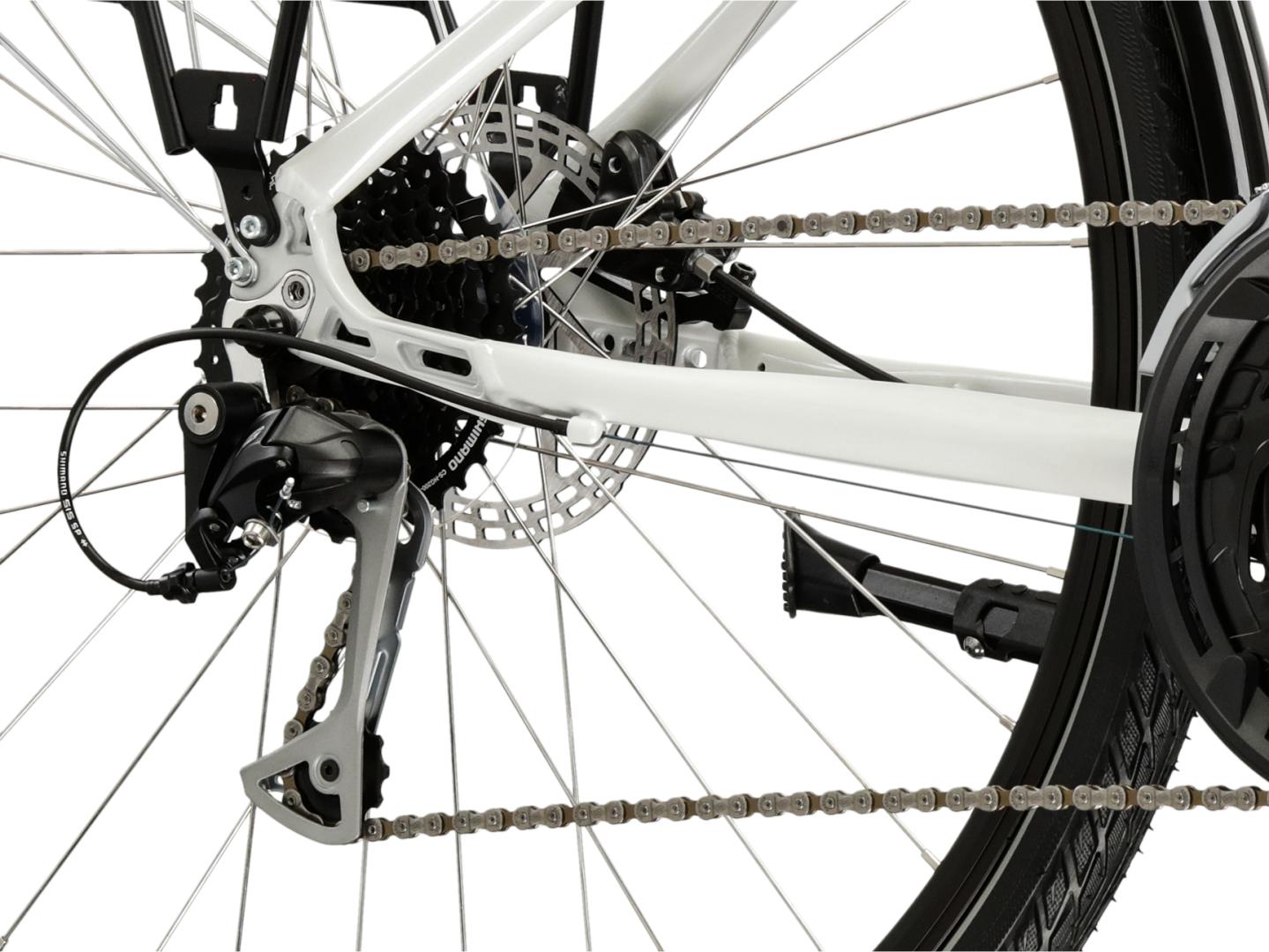 KROSS Trans 8.0 to rower turystyczny łączący cechy przydatne podczas rekreacyjnych wypraw, jak i codziennego zastosowania. Lekka, aluminiowa rama oraz amortyzowany widelec SR Suntour zapewniają komfort jazdy zarówno po asfalcie, jak i w trudniejszym terenie. Napęd Shimano w systemie 3x9 umożliwia płynne dostosowanie przełożeń do każdej trasy, a hydrauliczne hamulce tarczowe gwarantują bezpieczeństwo i kontrolę. KROSS Trans 8.0 został zaprojektowany, aby zapewnić jak największy poziom komfortu zarówno podczas wypraw za miasto, jak i podczas dojazdów do pracy.